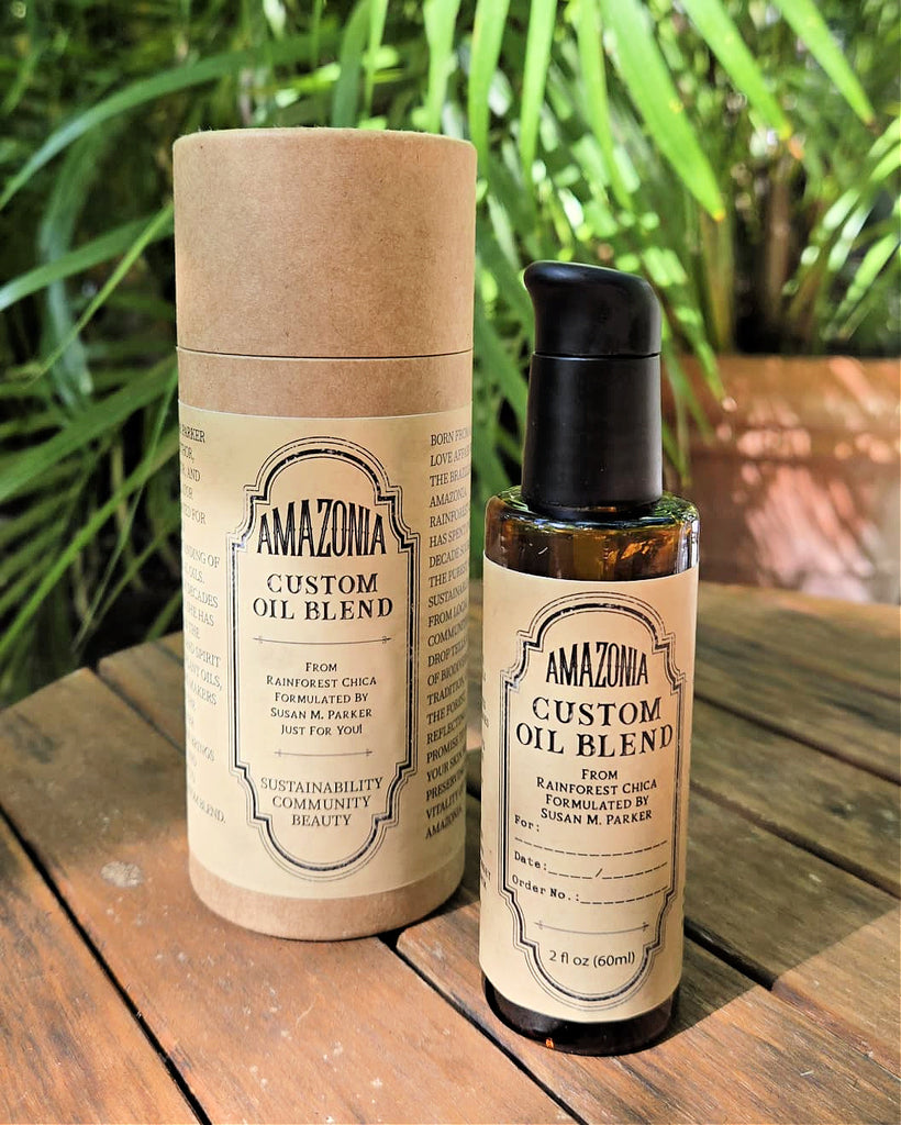 Your oil comes in an amber glass bottle designed to feel good in your hands. The treatment pump has a protective lid and locks for travel. Amazonia arrives in a reusable paper tube and includes an instruction card written by Susan.